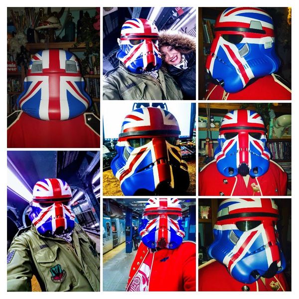 CUSTOM UNION FLAG STORMTROOPER HELMET. This is a one-off, custom Stormtrooper Helmet, covered with a complete Union Flag, Join an older Empire... This is a beautiful art piece, this Helmet is unique and any Art / Star Wars collector's dream. This Helmet is wearable and comes with a fitted visor and basic padding.