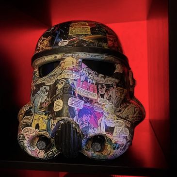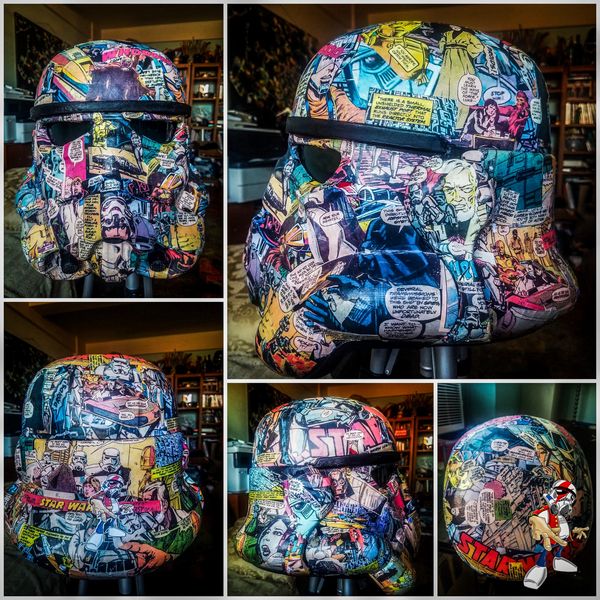 COMIC DECOUPAGE STORMTROOPER HELMET. This is a one-off, custom Stormtrooper Helmet, Covered Decoupage Style with 1977 Marvel Star Wars Comics to create an individual Helmet, no two are the same. A mashup of art styles, this helmet is unique and any Art / Star Wars collector's dream. This Helmet comes with a fitted visor and basic padding.