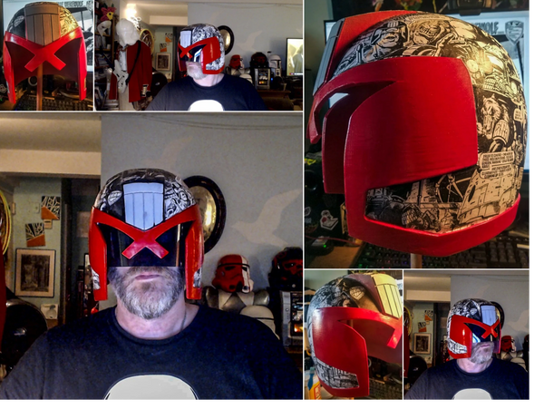 2000 AD / JUDGES HELMET - Custom Judges Helmet with Decoupage "Cry of The Werewolf" Comics. This is a one-off, custom Judges Helmet. Covered with panels from the comics, this Helmet is unique and any Dredd/2000 AD collector's dream. This beautiful finished Helmet is wearable and comes with a fitted visor and basic padding.